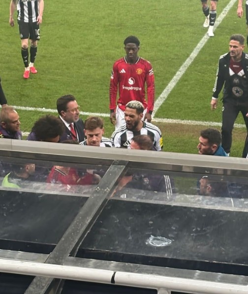 曼联本轮不敌纽卡,上半场结束时,马奎尔对着霍兰德表达不满,乔林顿在马奎尔身后低声抱怨。B费和乔林顿互相指责,工作人员不得不将两人拉开,B费指着乔林顿,或许是在提醒他,能留在场上已经很幸运了。